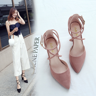 包头凉鞋字扣带尖头小清新高跟鞋