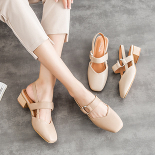 2018夏季新款粗跟方头复古高跟凉鞋